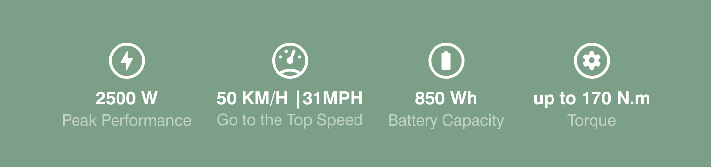 The removable 52V, 850wH battery offers up to 100 km of range in pedal-assist mode and up to 35 km using just the throttle. Maximum charge time is 5 hours.